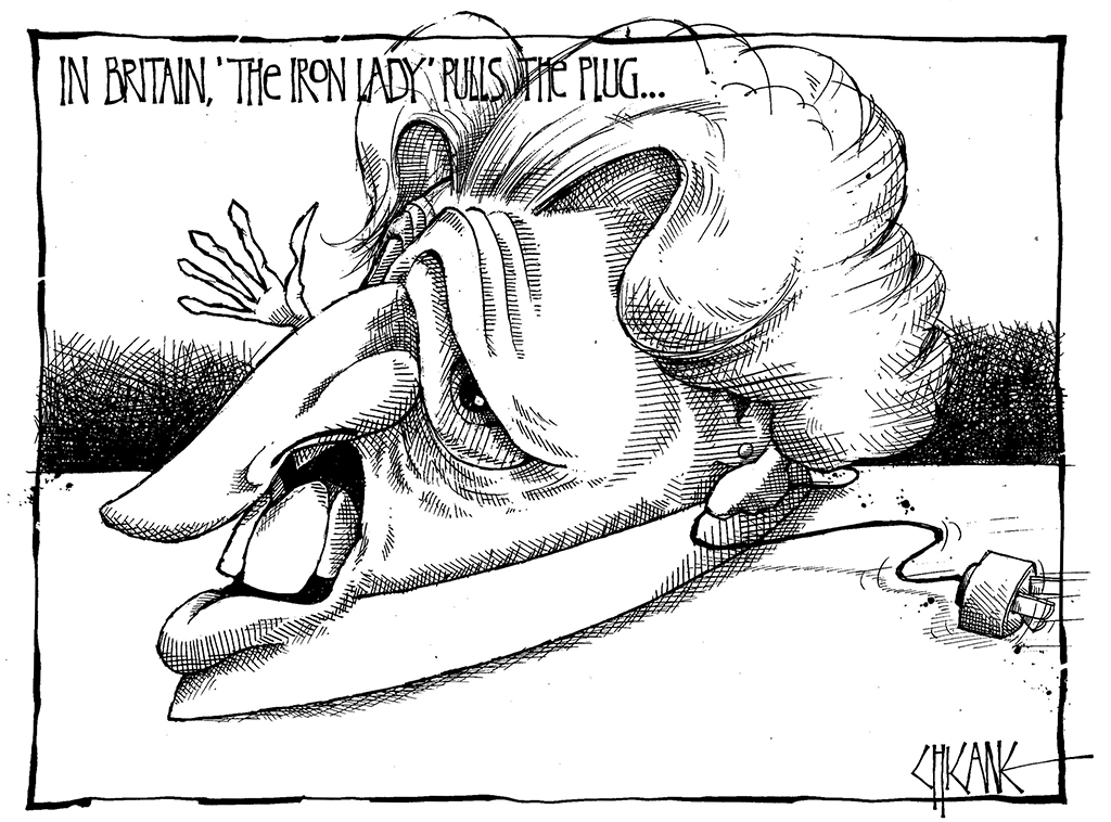 Looking through my old ‘toons. This was published in The Mirror (in New Zealand), in 1990, after Britain’s first female Prime Minister Margaret Thatcher called it a day.