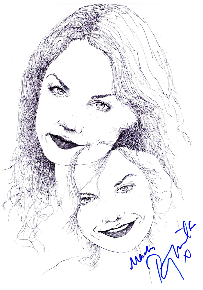 On a night better for ducks, the constant rain and an uncovered stage door was a challenge for autograph collecting – Sharpies and showers! So there’s more water than ink on the sketch as both Ben and Diana kindly dodged the drops to sign – sorry about the dodgy scan, it’s not the flattest of drawings any longer!