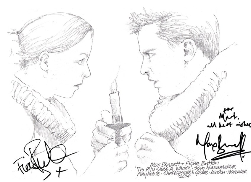 Published December 11, 2014 at 1000 × 728 in Drawing: Max Bennett and Fiona Button in Tis Pity She’s a Whore at Shakespeare’s Globe
