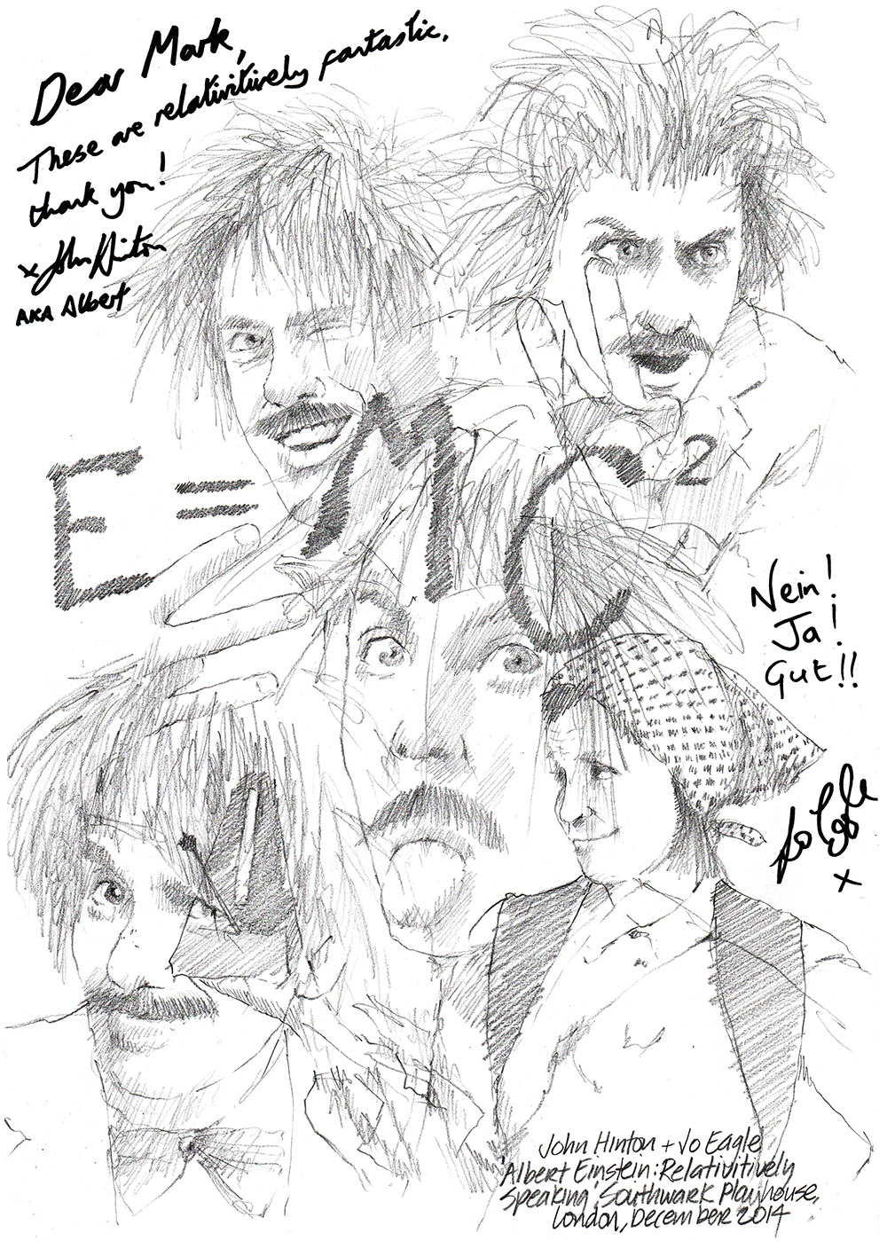 Published January 1, 2015 at 1000 × 1408 in Drawing: John Hinton and Jo Eagle in Albert Einstein: Relativitively Speaking at the Southwark Theatre