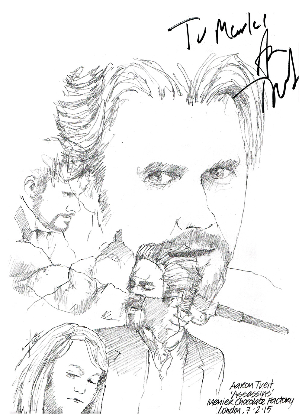 Published February 11, 2015 at 1000 × 1373 in Sketch: Aaron Tveit in Assassins at the Menier Chocolate Factory