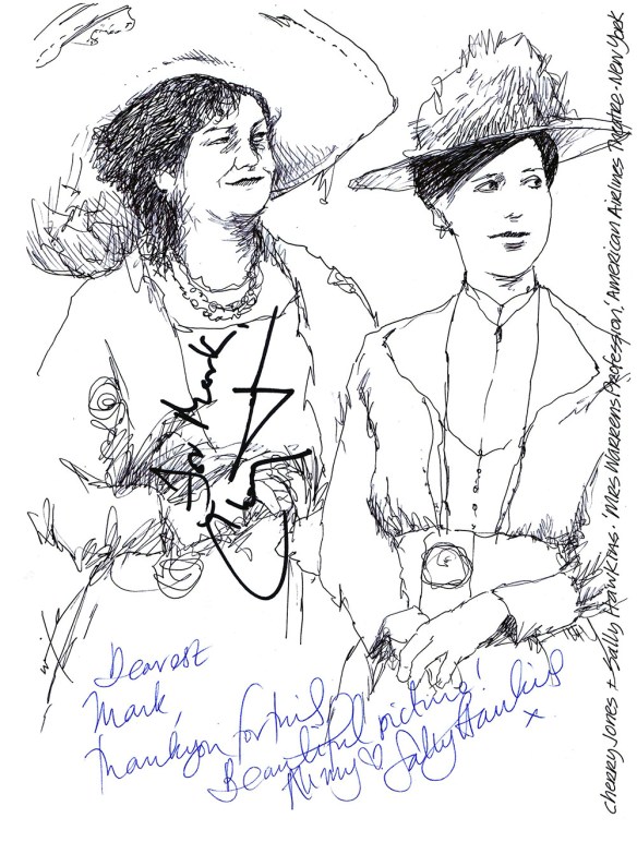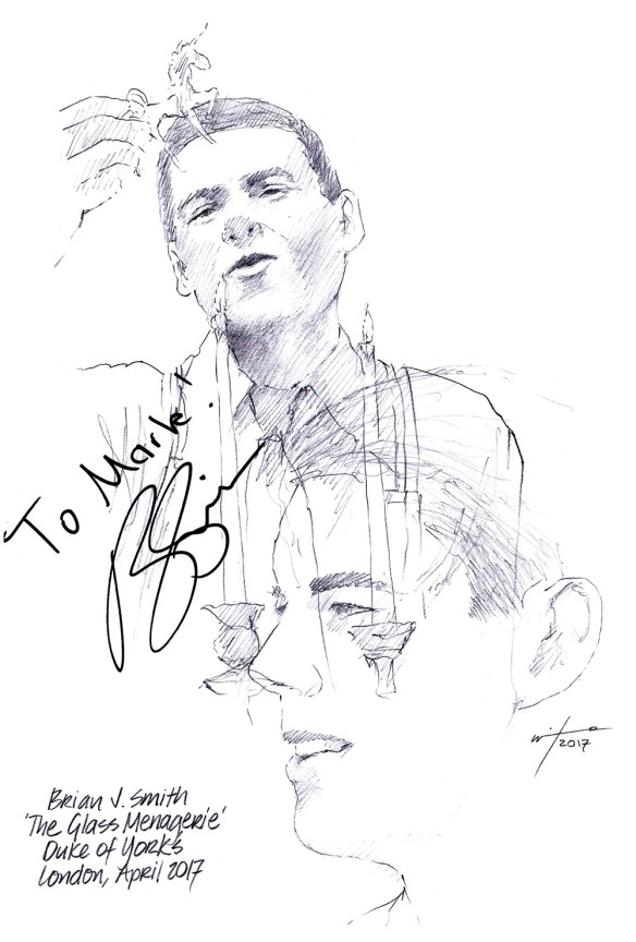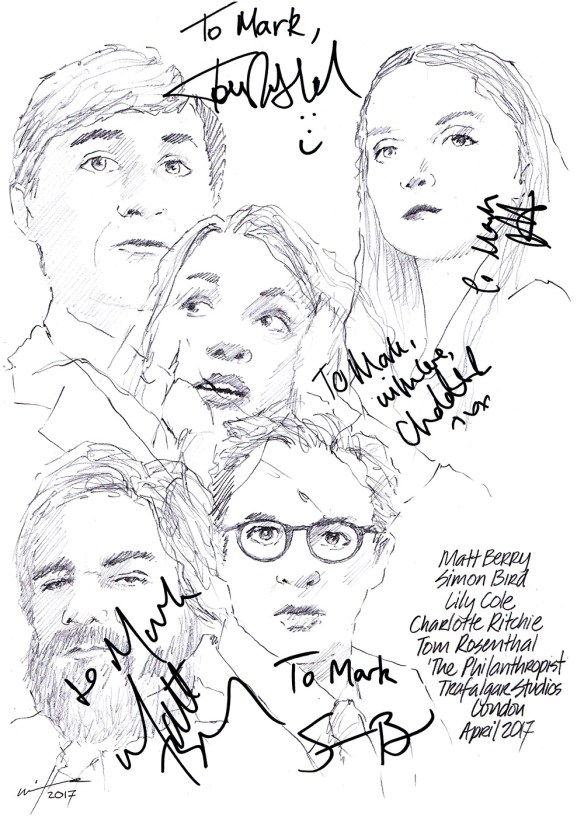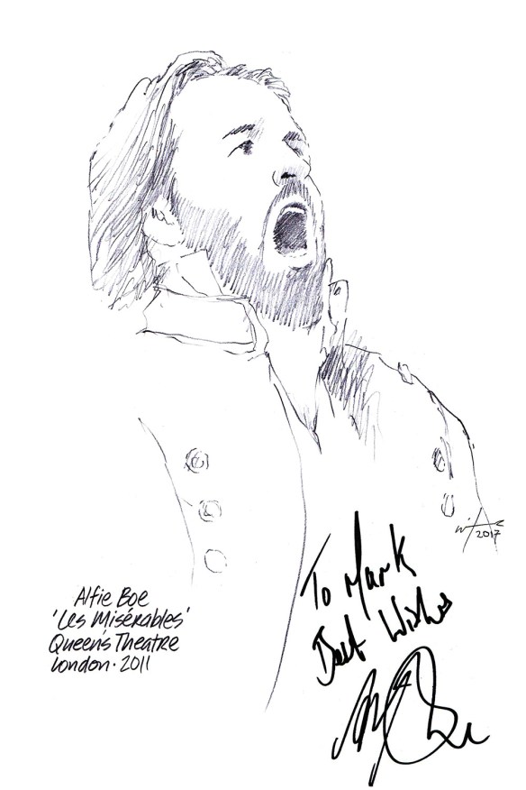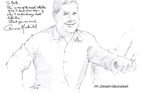 For the past fifty years he has produced more musicals than anyone else in history and the three longest running musical productions – LES MISERABLES, THE PHANTOM OF THE OPERA, and CATS , as well as OLIVIER! and MISS SAIGON. Not bad for someone who started out as a stagehand at the Theatre Royal, Drury Lane. Although I had met Sir Cameron on a few occasions I had never drawn him, so I did just that and dropped it into his London office and he immediately returned it with this very complimentary note.