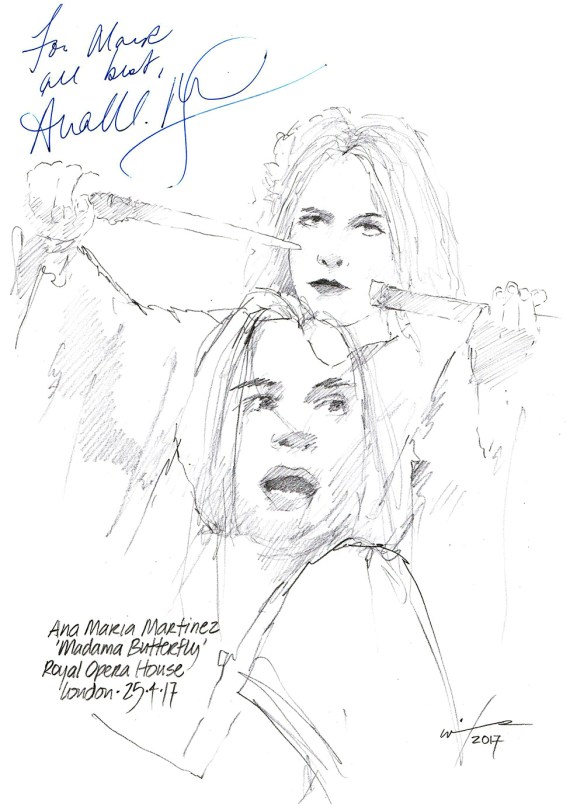 Puerto Rican-American soprano Ana Maria Martinez returned to Covent Garden last month to play the lead role of Cio-Cio-San in the Royal Opera’s production of Puccini’s MADAMA BUTTERFLY. Since making her Royal Opera debut as Donna Elvira in DON GIOVANNI in 2002, Ana Maria has starred in a number of productions including MADAMA BUTTERFLY when she replaced the ill Alexia Voulgaridou in 2015. She is very familiar with the character of Cio-Cio-San, having also performed the part for the Metropolitan Opera and the Barvarian and the Vienna State Operas among others.Ana Maria signed my sketch after the final night performance in London last week.