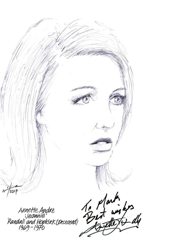 Australian actress Annette Andre appeared in a number of high profile British TV shows in the 1960’s and 70’s, including THE AVENGERS, THE SAINT and THE PRISIONER, with her longest running role as Marty Hopkirk’s widow Jeannie in the Private detective series RANDALL AND HOPKIRK (DECEASED). She starred alongside Mike Pratt and Kenneth Cope who played private detectives Jeffrey Randall and Martin Hopkirk respectively, the later returning as a ghost after he was murdered while investigating a case. Annette was speaking at the Museum Of Comedy in London a couple of weeks ago about the show and her career. I managed to catch up with her afterwards and she signed this Jeannie portrait for me.