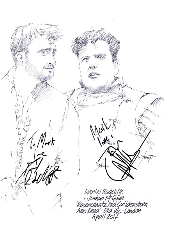 It’s the ultimate identity crisis when two hapless minor characters, flipping coins while watching Shakespeare’s HAMLET from the wings. In his four-star review the Guardian’s Michael Billington said, “Radcliffe is perfectly matched by Joshua McGuire in a nimble hire-wire act that balances quickfire humour with a poignant awareness of death.” Both Dan and Joshua signed my sketch a couple of weeks ago after a Saturday evening performance at the Old Vic.