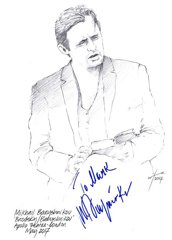 Joseph was a huge influence on ‘Misha’ In the years the later revolutionised and popularised ballet as a performer and choreographer, while launching a successful parallel career as an actor, earning an Oscar nomination playing Yuri Kopeikine in the 1977 film THE TURNING POINT. Their relationship forms the basis for Latvian director Alvin Hermanis’s experimental theatre piece, BRODSKY/BARYSHNIKOV in which Mikhail reads his friend’s poetry in the original Russian. After productions in Riga, Te Aviv and New York Mikhail, performed the show for five nights at the Apollo Theatre in London, where I managed to meet him at the stage door and he signed my sketch.