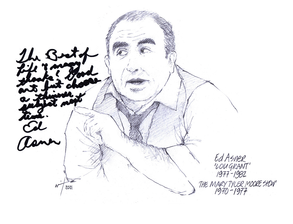 I always meant to write to Ed Asner. The various lockdowns gave me the time to do so. I’m pleased I did. Sadly he passed away on Sunday at the age of 91. I drew this quick drawing of Ed in his defining television role as Lou Grant, the burly, blustery but lovable newsman and sent it to him at his Tarzana home in Los Angeles in April this year. He signed, dedicated and returned it within a week, along with my postage money.