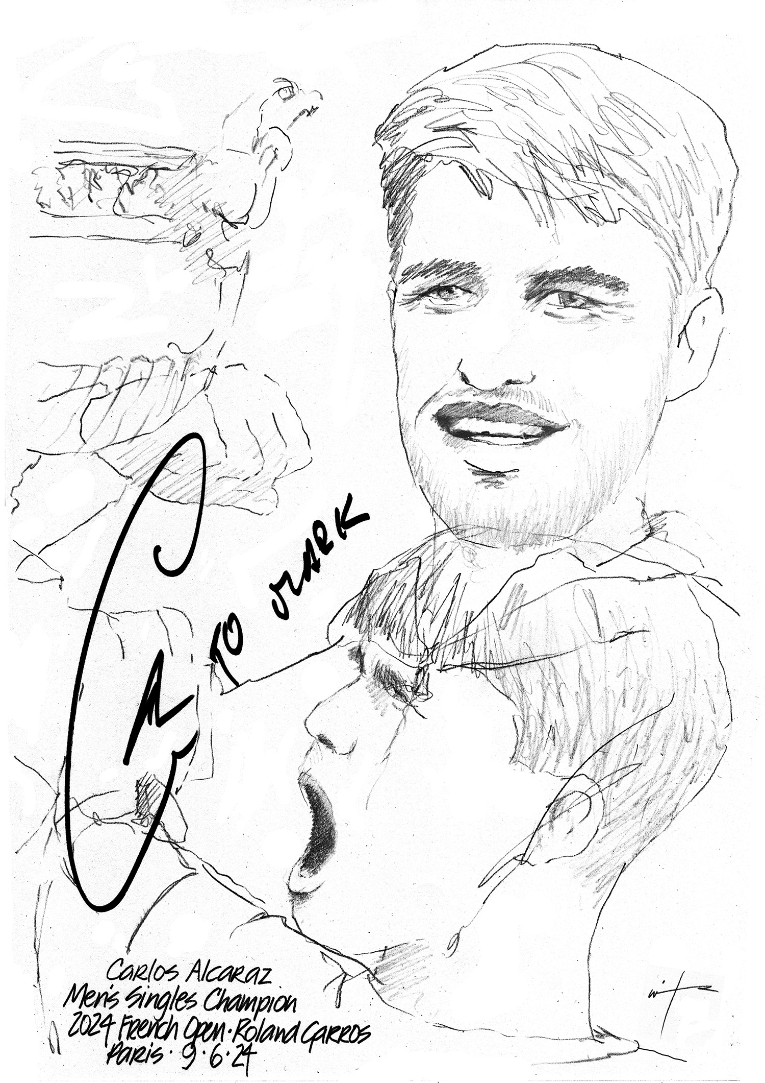 Carlos signed my sketch at this year’s Cinch Championships at London’s Queen’s Club. He collected £2,700,000 for winning The Championships. Nice pay day for seven matches in a fortnight.
