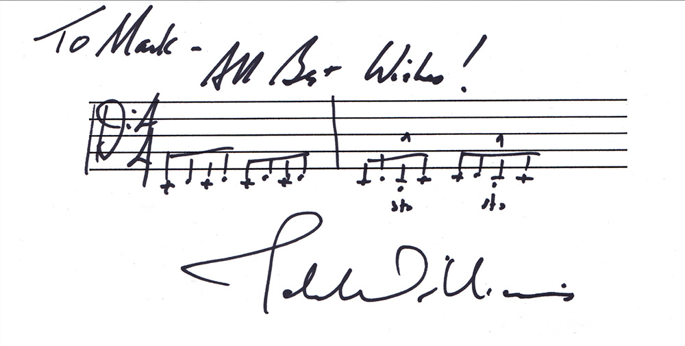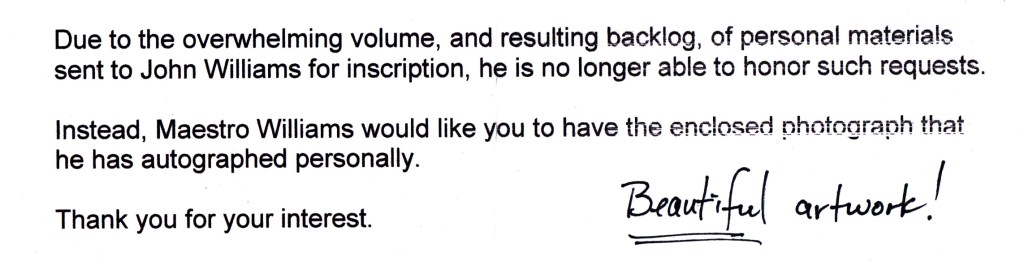 I’ve had the privilege of meeting the maestro once, when he and George Lucas were at ShoWest in Las Vegas in the 1990s. He was conducting the local symphony orchestra performing a number of STAR WARS medleys. From 1983 to 1993 John was principal conductor of the Boston Pops succeeding Arthur Fiedler. While there he signed a card for me adding the opening few bars of the infamous dum dum dum dum Intro to JAWS. A few years ago I sent this sketch to his agent hoping to get it signed, but unfortunately it wasn’t possible.