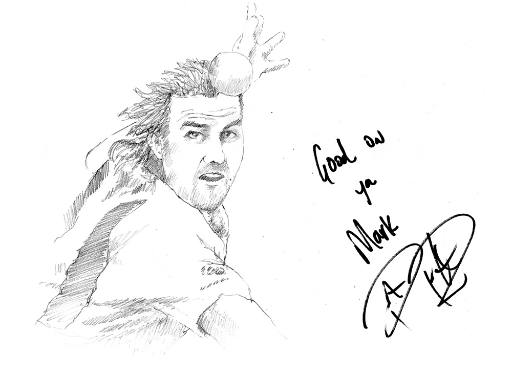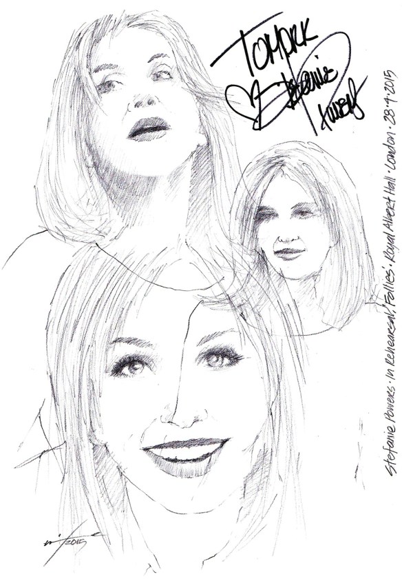 I left this sketch, which depicts Stefanie rehearsing for Follies and an earlier portrait, at the Royal Albert Hall and she signed, dedicated and returned it for me.