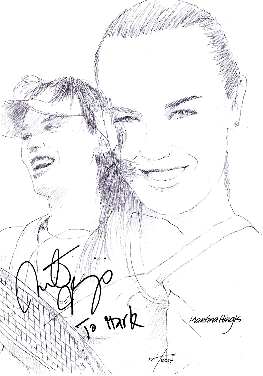 His cheeky ‘tweener’ – a beteen the legs stoke that sent the ball out of Nadal’s reach, went viral on YouTube, amassing more than 500,000 views. I was actually at The Championsoips on ‘the’ day and watched events unfold from ‘the hill’, amongst a very vocal group of Aussie supporters and manged to get this sketch to him the next day, which he signed and returned along with a clipping from The Times reporting his sensational victory.